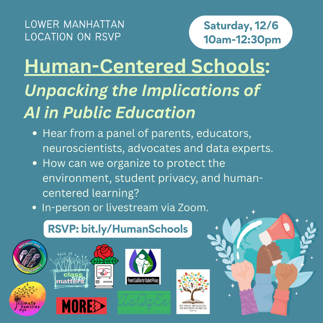 Join MORE-UFT, Climate Families NYC, AQE-NY, Racially Just Public Schools, Class Size Matters, CEC-4, Parents for AI Caution and more for an informative workshop on AI in NYC schools.
