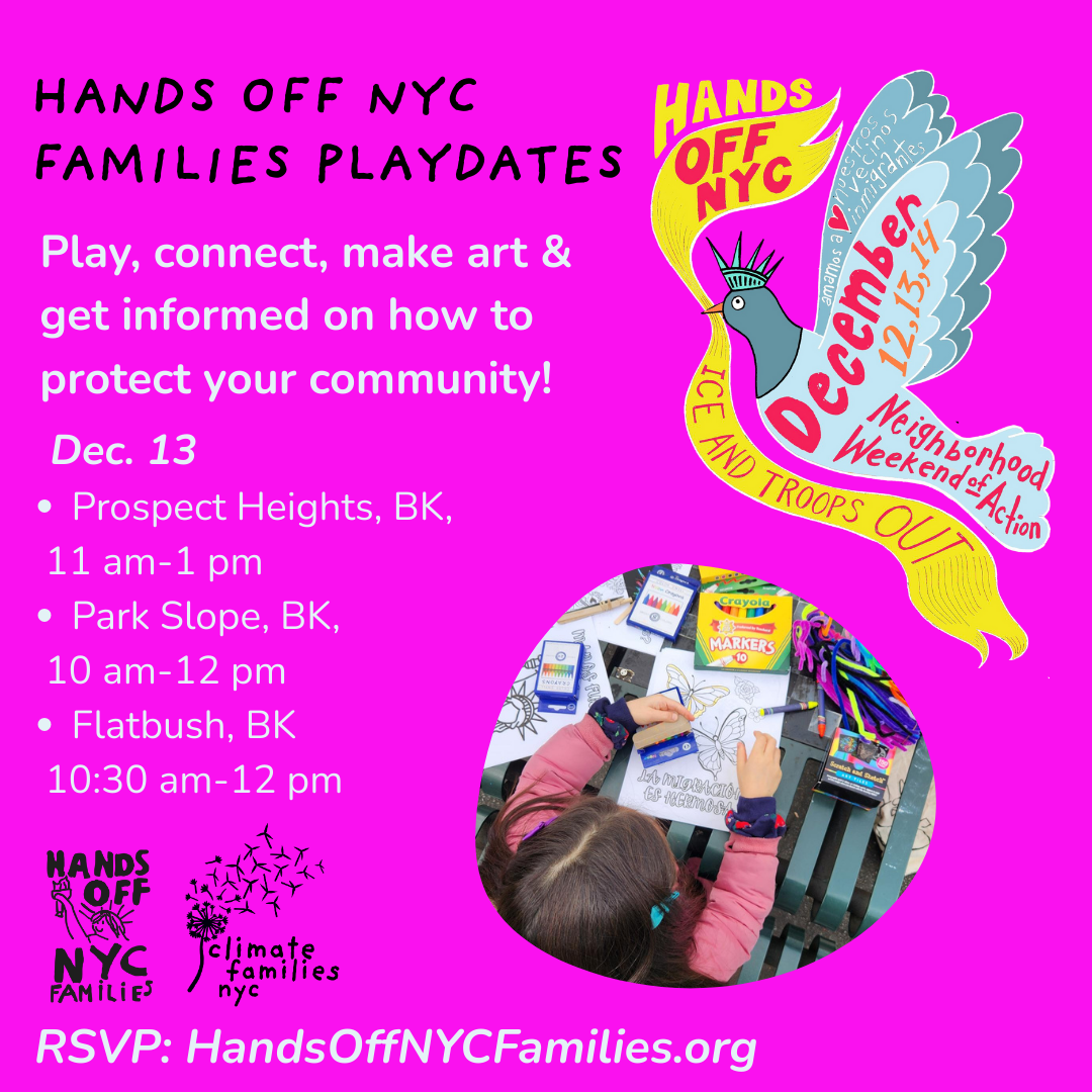 As part of a Hands Off NYC Weekend of Action, we're joining parents via Hands off NYC Families to post up at playgrounds around the city with Know your rights materials, art activities for kids and flyers for adults.